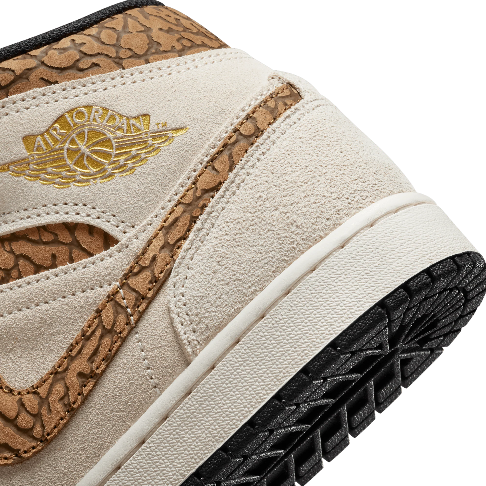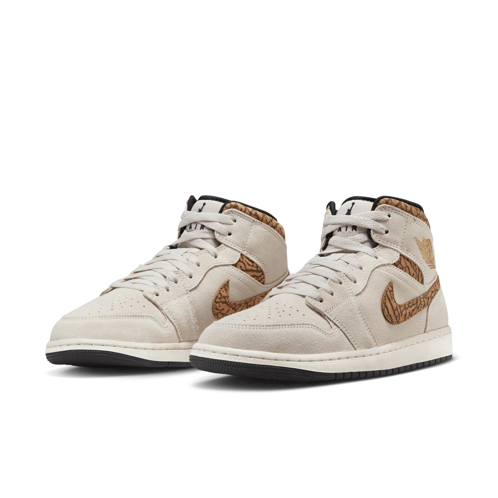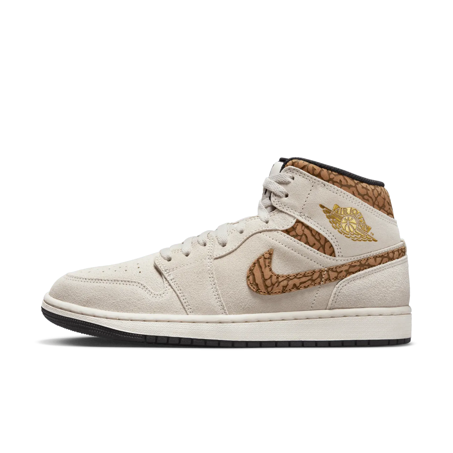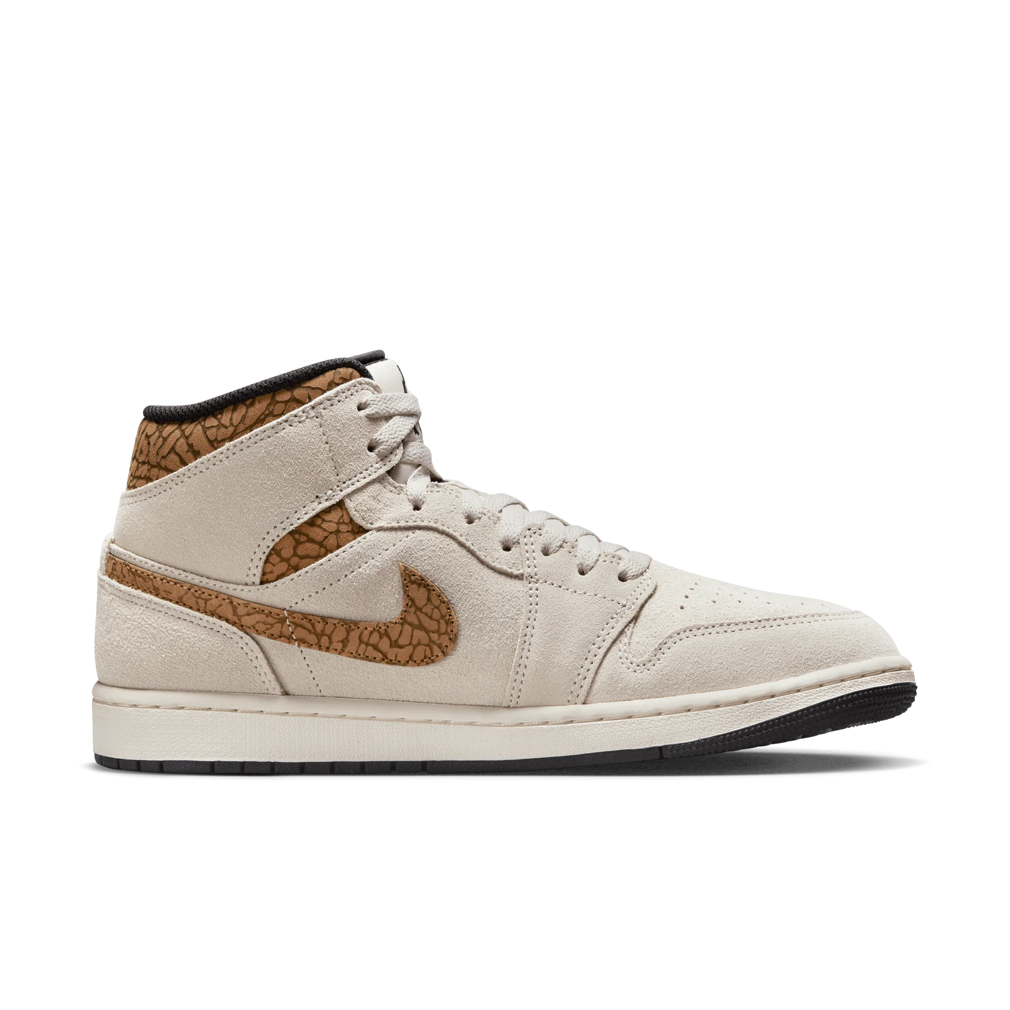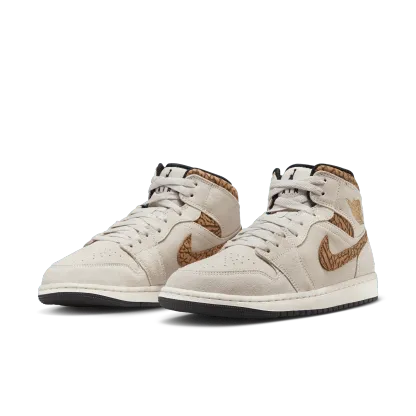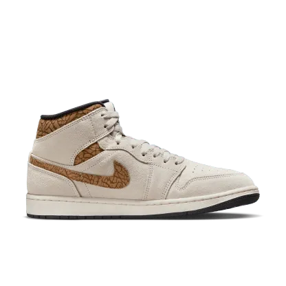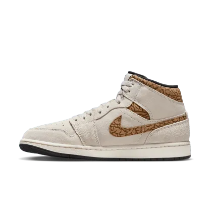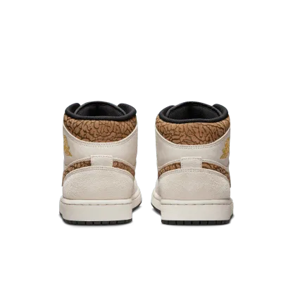 The mid top version of the original Air Jordan embodies everything you love about the Air Jordan 1 MID. This "Brown Elephant" colorway layers different shades of brown and elephant print on top of a light british tan body with white and gold Jumpman tongue tag, elephant leather leather swoosh and "Jordan Wings" logo on the ankle filling in the details. The white rubber midsole contains an Air-Sole unit in the heel and is capped off with a black outsole.