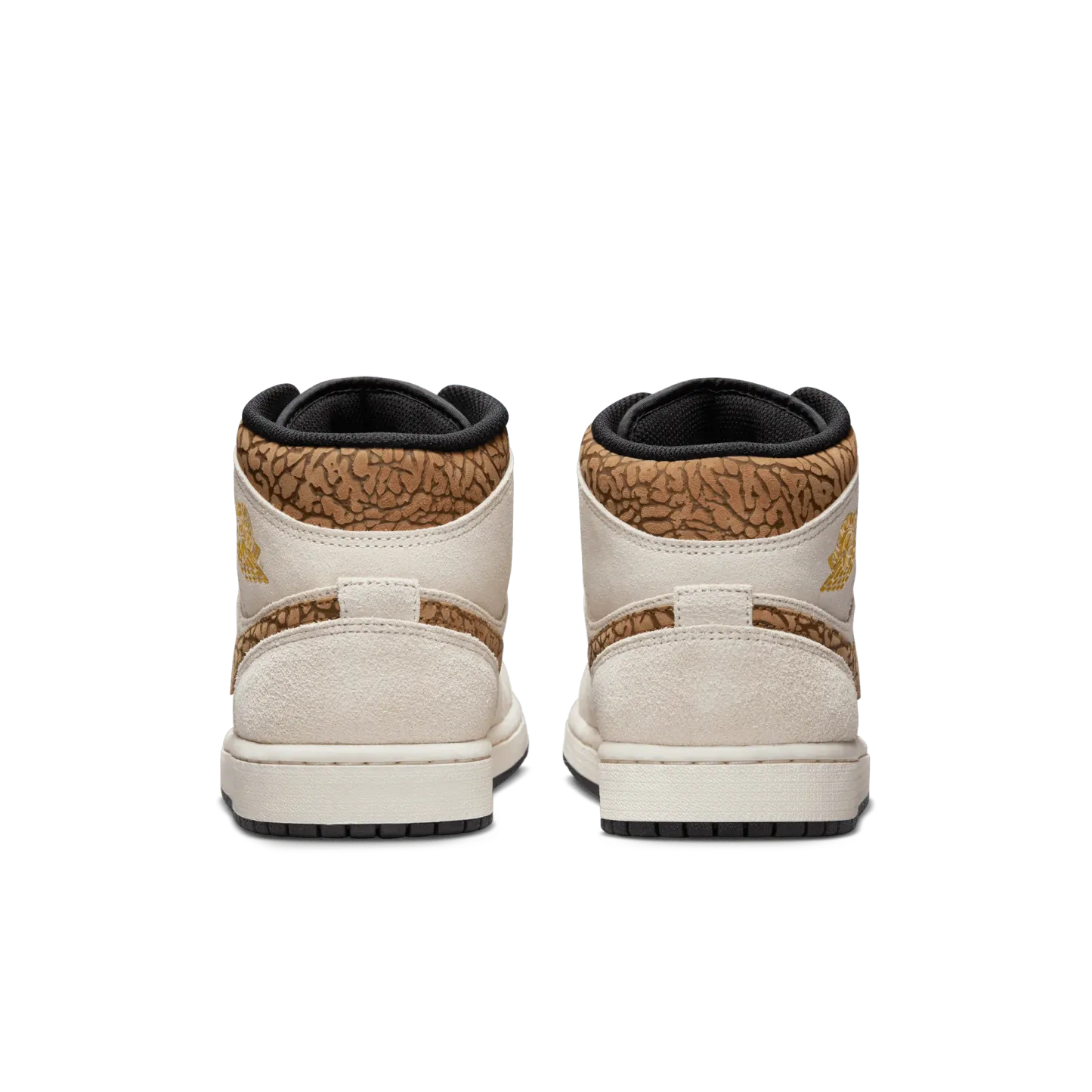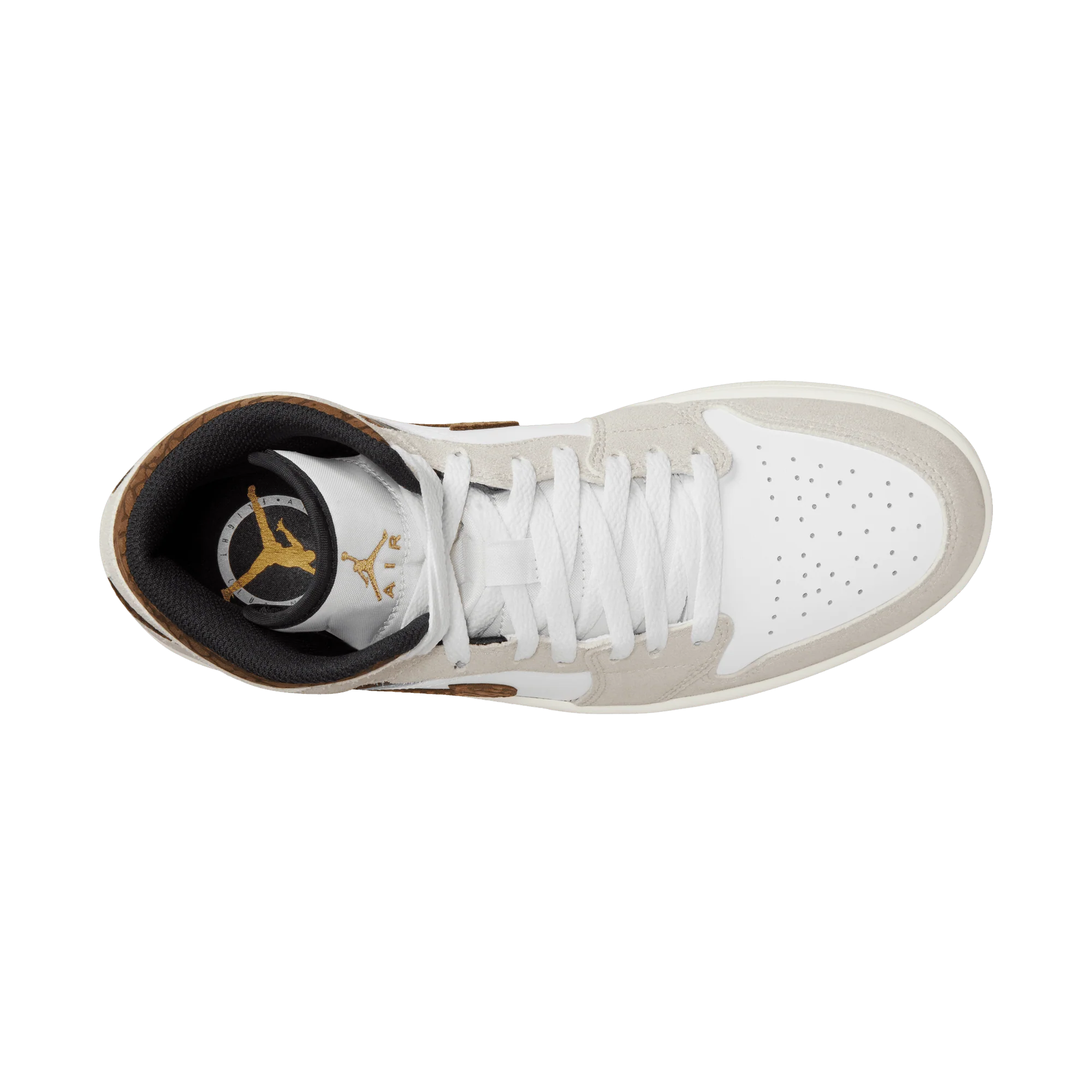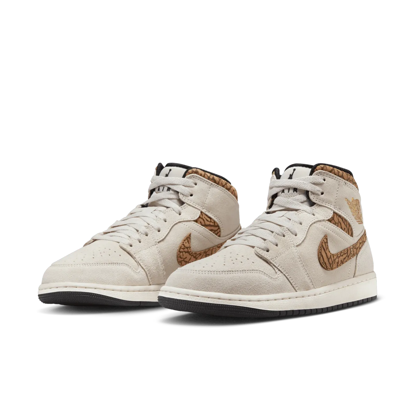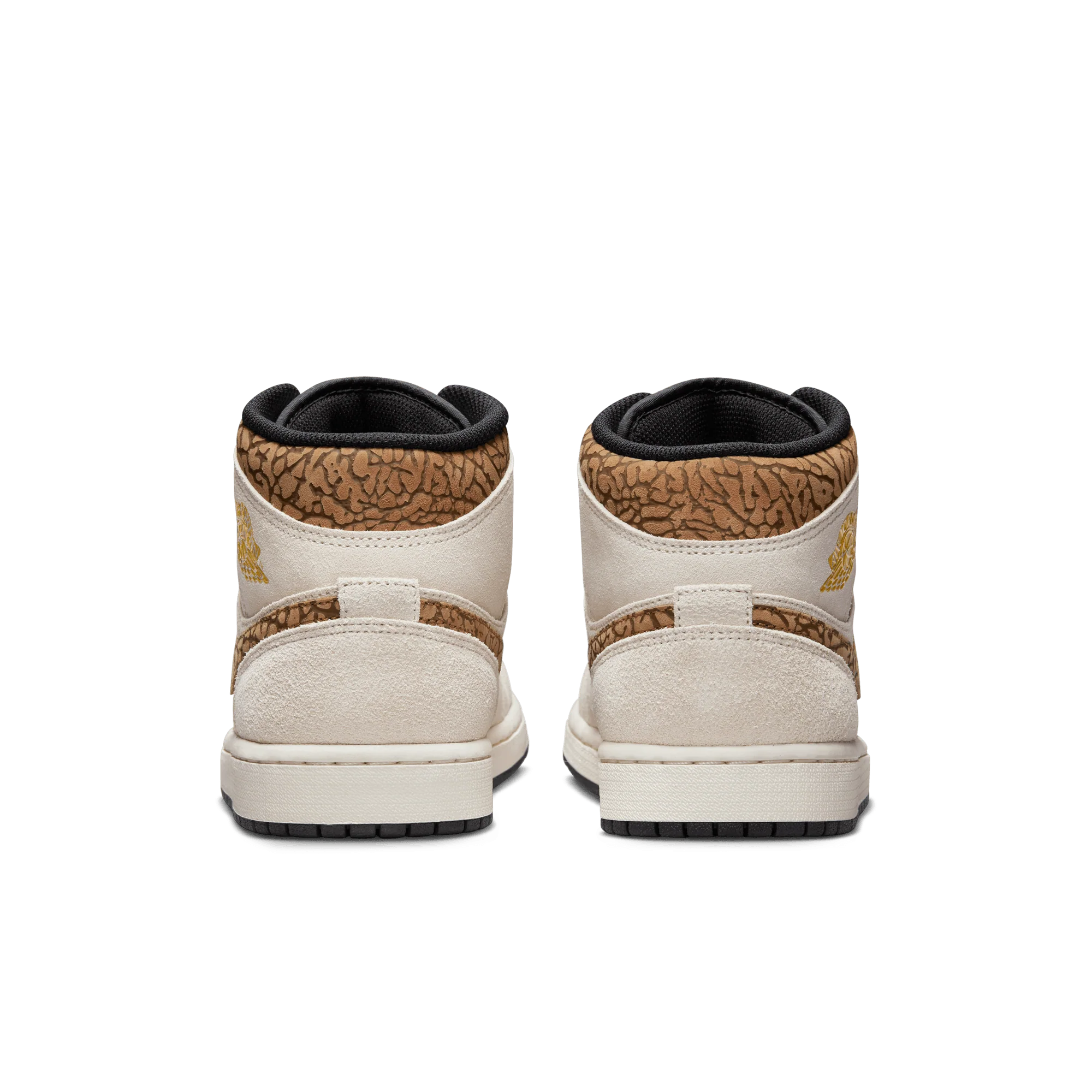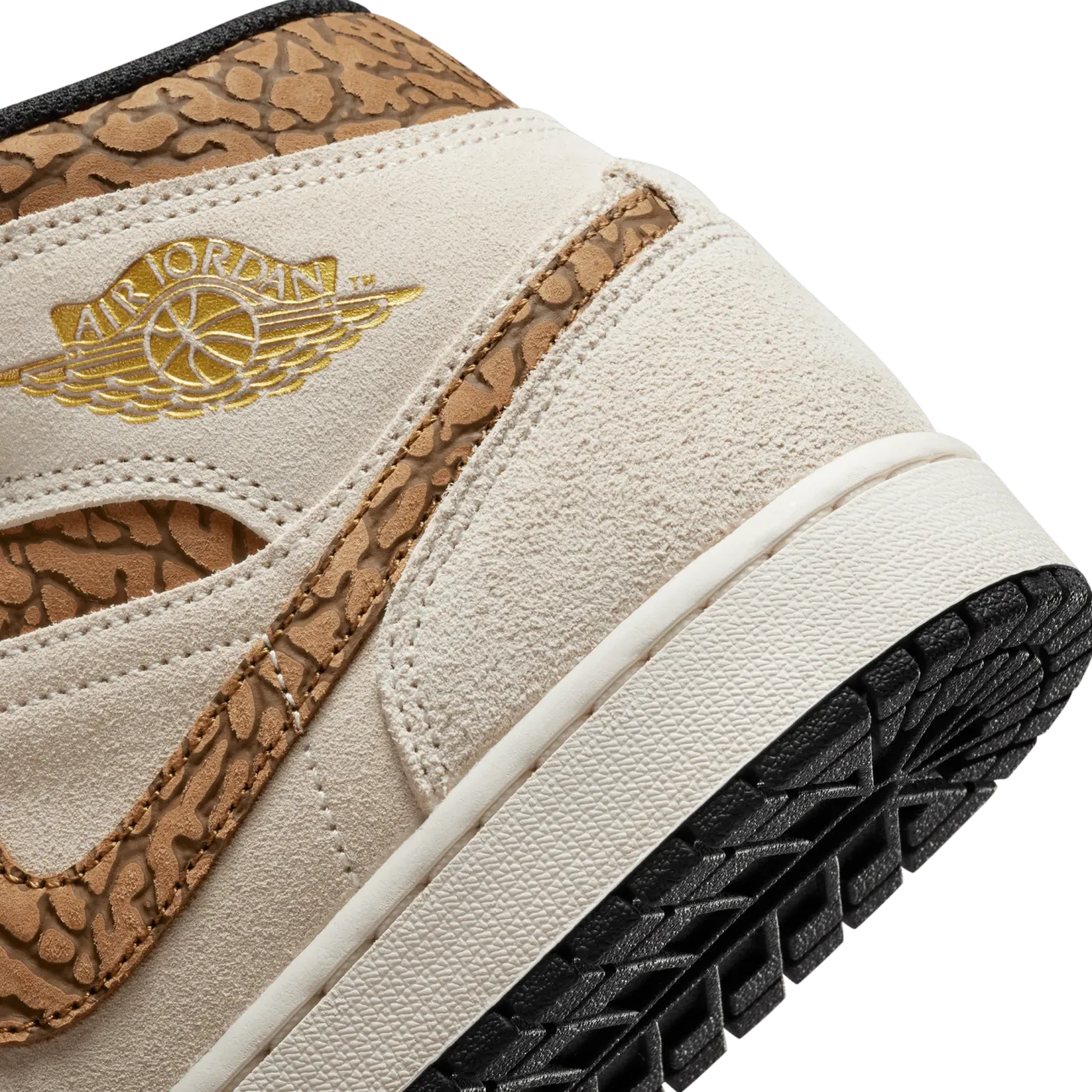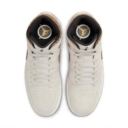 The mid top version of the original Air Jordan embodies everything you love about the Air Jordan 1 MID. This "Brown Elephant" colorway layers different shades of brown and elephant print on top of a light british tan body with white and gold Jumpman tongue tag, elephant leather leather swoosh and "Jordan Wings" logo on the ankle filling in the details. The white rubber midsole contains an Air-Sole unit in the heel and is capped off with a black outsole.