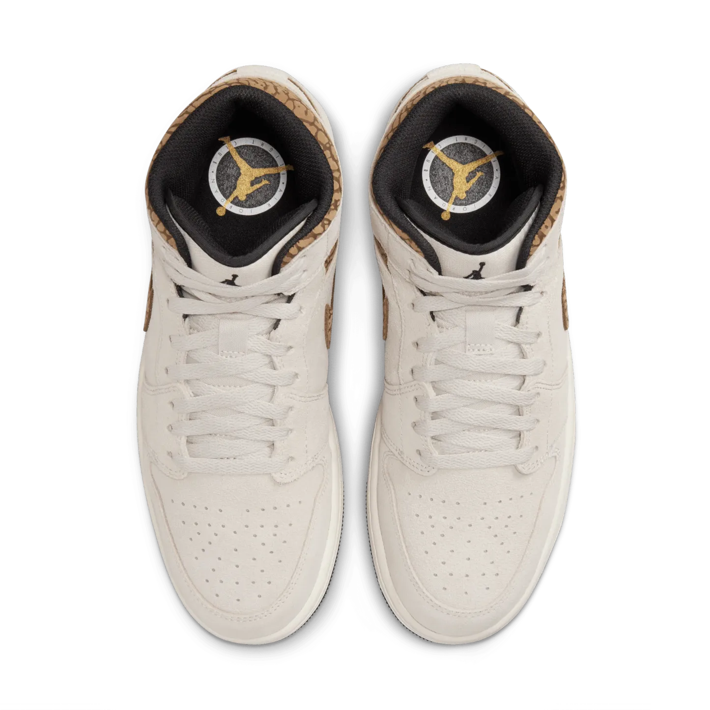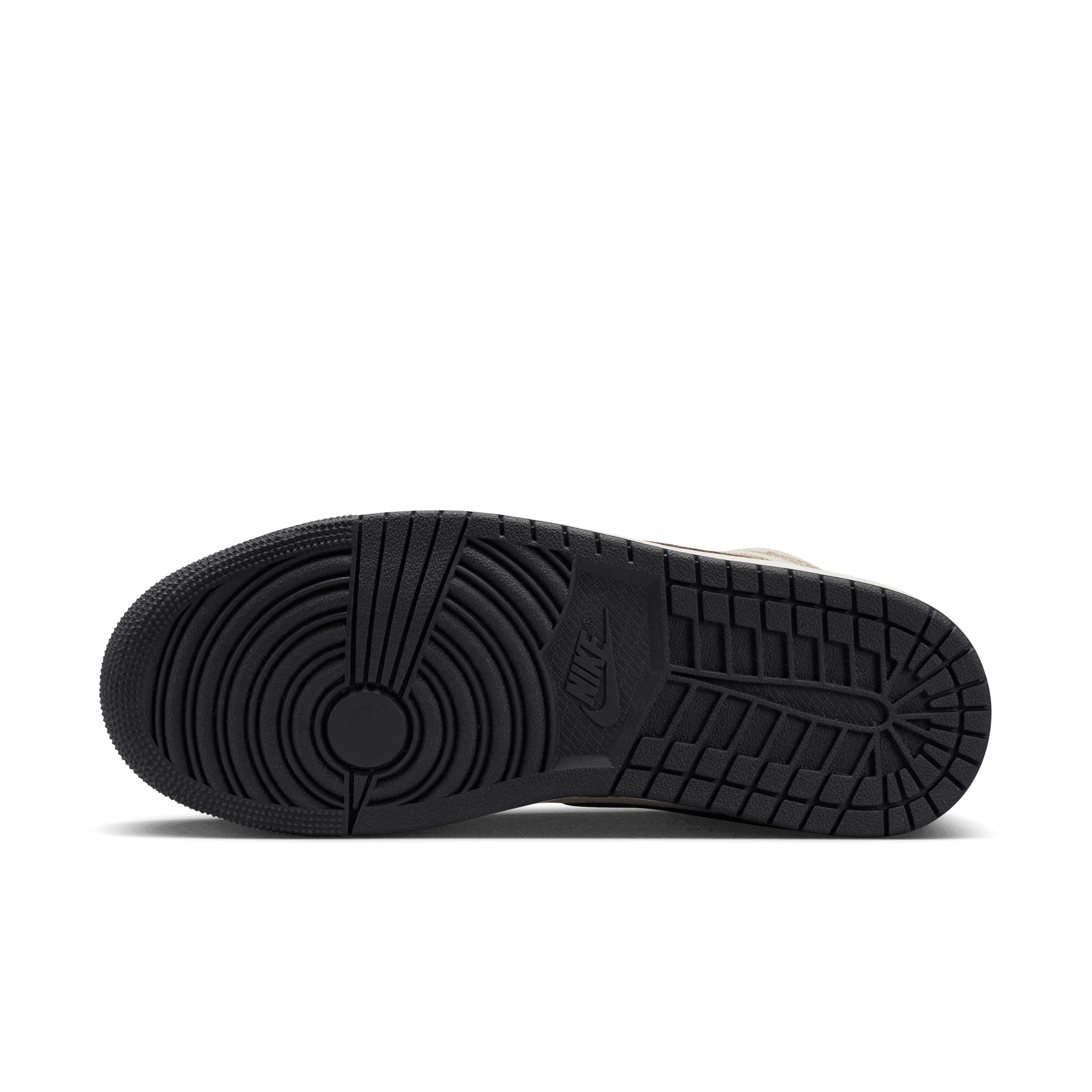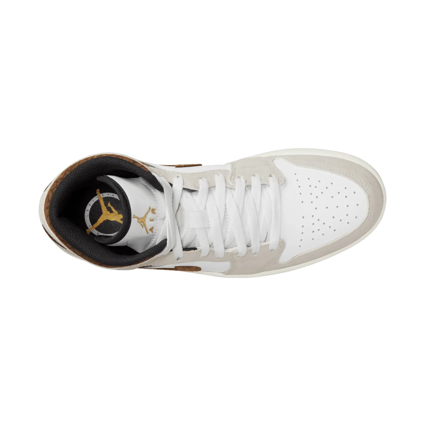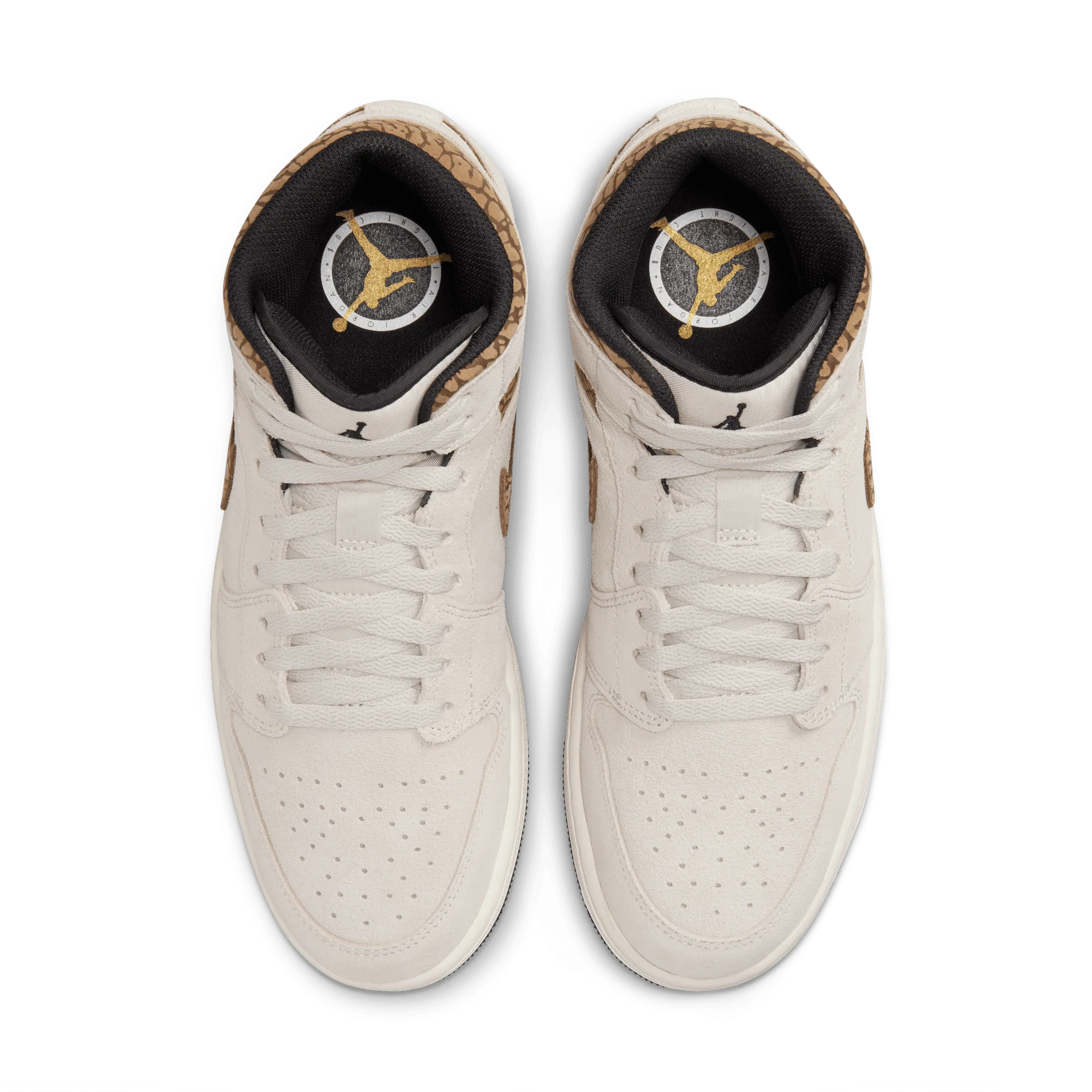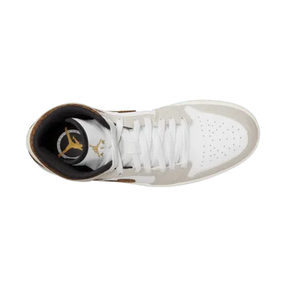 The mid top version of the original Air Jordan embodies everything you love about the Air Jordan 1 MID. This "Brown Elephant" colorway layers different shades of brown and elephant print on top of a light british tan body with white and gold Jumpman tongue tag, elephant leather leather swoosh and "Jordan Wings" logo on the ankle filling in the details. The white rubber midsole contains an Air-Sole unit in the heel and is capped off with a black outsole.